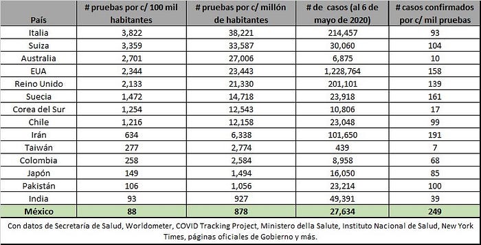 Inclusive, diversos estudios han demostrado que somos uno de los países que menos pruebas ha hecho, con respecto a la cantidad de habitantes que tenemos. Aquí tenemos el levantamiento de información que hizo Valeria Moy, con información de distintas fuentes públicas de los gobiernos internacionales: